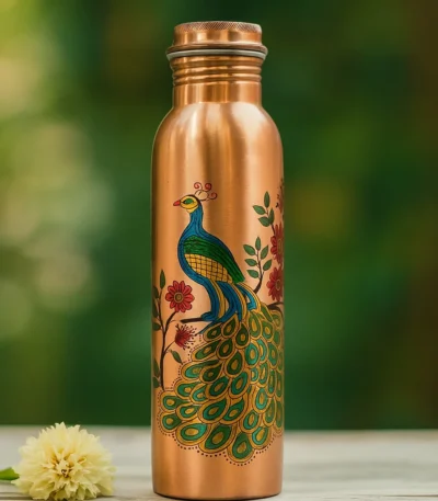 Tamra Veda Artisan Pure Copper Water Bottle (950ml) | Leakproof Ayurvedic Vessel with Hand-Painted Peacock (Mayur) Design | Joint-Free & Seamless
