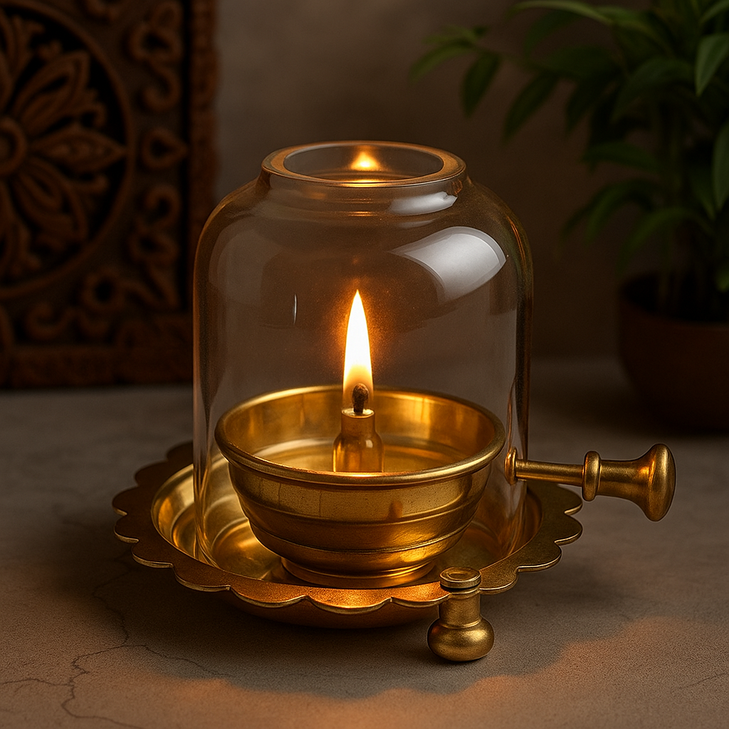 - Maintenance: Ensure the diya is placed on a stable, heat-resistant surface, keep flammable materials away, and use the protective glass cover to prevent accidental extinguishing. Refill oil/ghee and adjust the wick regularly to keep the flame burning.